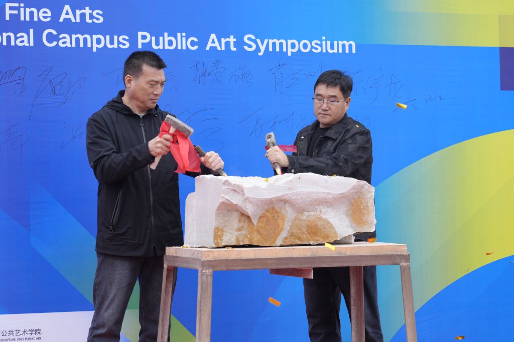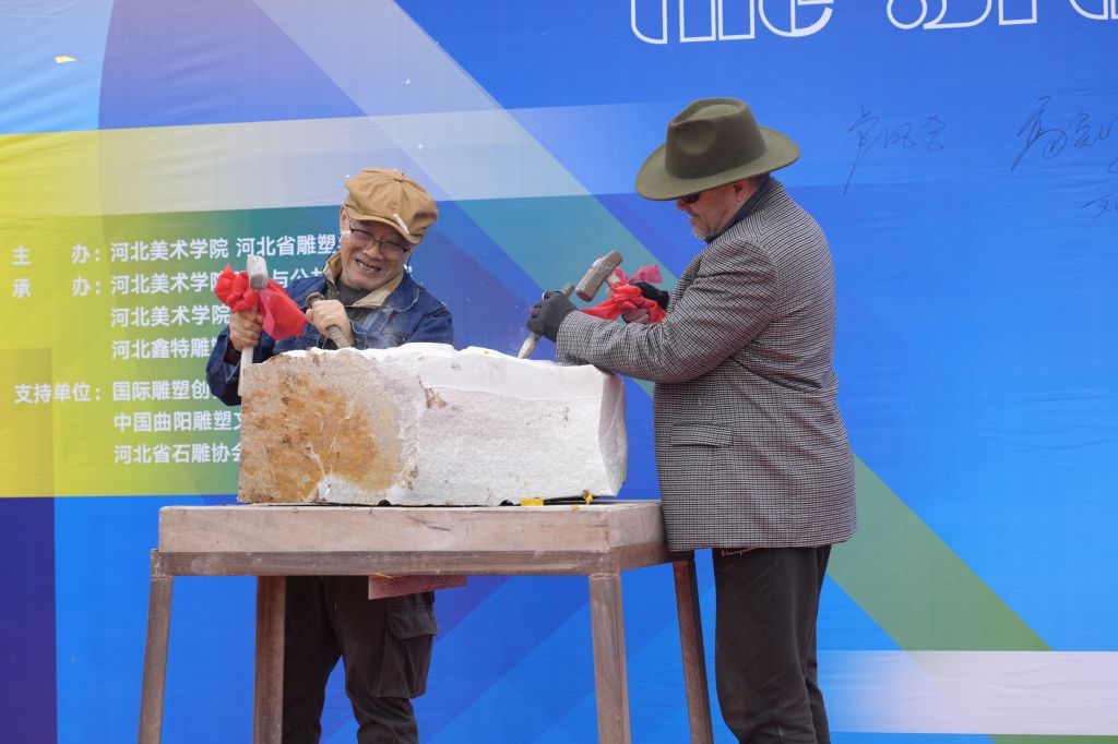随后,张子言、朱尚熹、约翰·戈加贝里什维利、宫旭鹏共同雕刻“艺术之石”,正式开启“2025·第三届河北美术学院国际校园公共艺术创作营”。