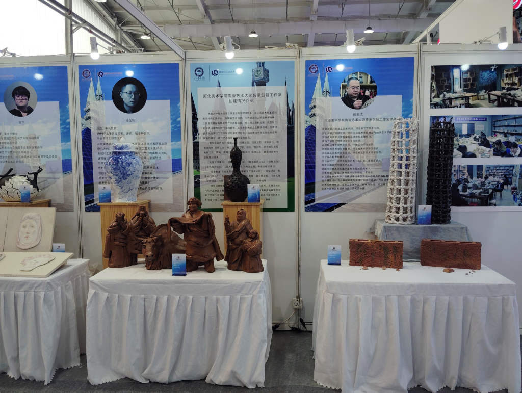 河北美术学院展区设在主展馆13号馆,展位面积54平方米,由工艺美术专业教师殷景太、吴昊带队,师生共6人参展。本届博览会同期举办“第十三届大地杯中国陶瓷创新与设计大赛”,我院共选送40余件(套)作品参展。展区以“传统技艺的当代表达与跨学科融合”为核心理念,重点展示了陶瓷材料在造型语言、工艺技术与艺术表达上的创新实践,受到来自全国优秀陶瓷企业代表及社会各界观众的关注与好评。