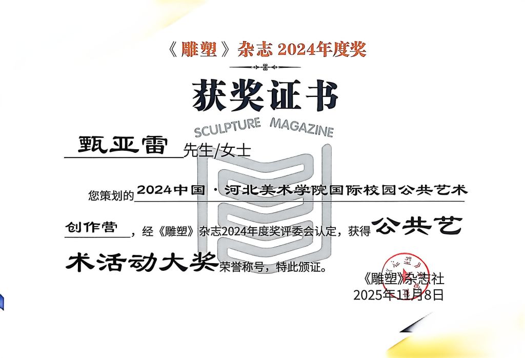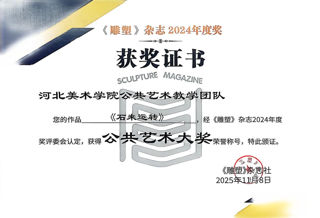 我院分别获《雕塑》杂志2024年度奖公共艺术大奖1项(河北美术学院公共艺术教学团队《石来运转》),公共艺术活动大奖1项(甄亚雷《2024中国·河北美术学院国际校园公共艺术创作营》),原创雕塑大奖1项(刘庆《爆炸成形雕塑实验研究》)另外,河北美术学院终身教授郭宝寨荣获“国之大匠成就奖”。